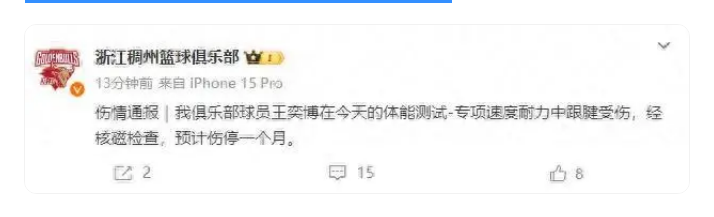 所幸的是在经历了第一时间的检车和治疗后,浙江男篮发布通报表示,经过核磁共振检测,王奕博的跟腱受伤,目前预计伤停一个月。伤停一个月,这也意味着王奕博如果恢复速度快一些,还是有机会赶上联赛的揭幕战的,不过按照跟腱的伤病通常需要大养的情况,再加上新赛季采取的外援四节7人制的情况下,浙江男篮的后卫线压力会下降很多,所以浙江男篮应该会给王奕博更多的休息时间,让王奕博能够更好的康复然后再回归球场,要知道当年的郭艾伦就是因为伤病还没有完全好久着急复出,出现了反复拉伤的伤病,继而让如今的郭艾伦出现了现在被动的情况。