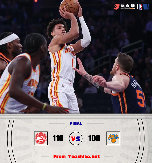 篮球直播吧3月6日讯 NBA常规赛,尼克斯今日迎战老鹰,前者上场比赛战胜骑士,后者则是两连败,此役特雷-杨、奥孔武、兰德尔、布伦森和阿努诺比缺战。比赛上来,老鹰就率先进入状态打出8-1的开局取得领先,分差也是逐渐拉开到了两位数,次节分差继续扩大到二十分以上,好在是尼克斯及时调整才稍稍止血,半场结束时老鹰仍领先11分;下半场回来,老鹰的命中率下滑明显,尼克斯打出一波15-1的攻势直接抹平分差,但他们还是没能把握住反超的机会,重新稳住阵脚的老鹰在末节再次拉开分差,最终老鹰轻取尼克斯结束连败。