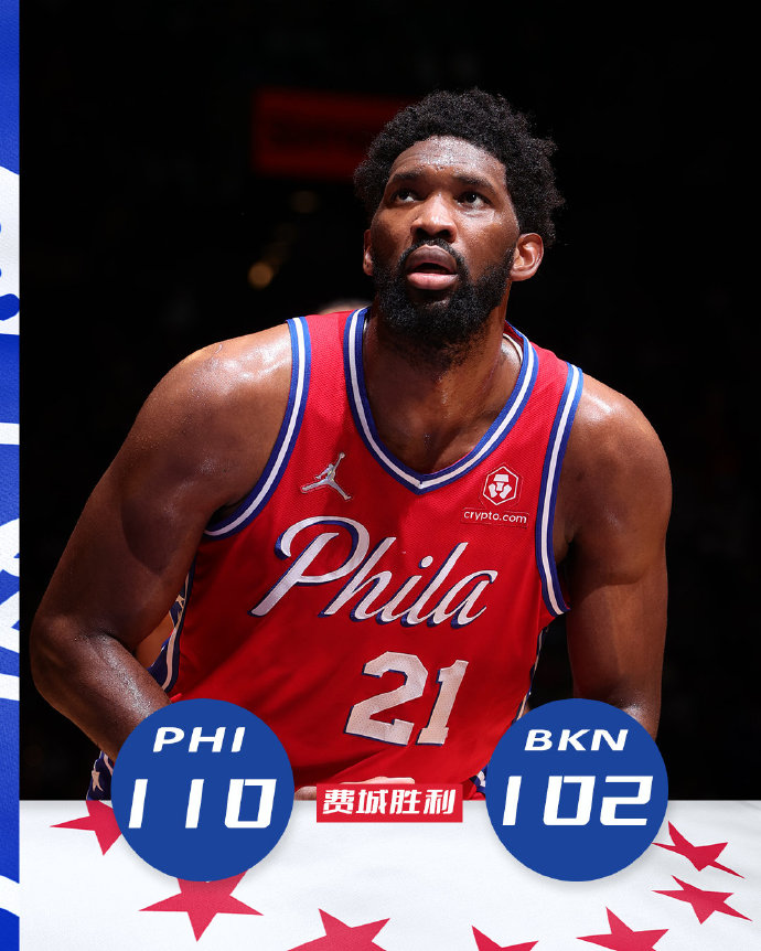 76人(19-16):恩比德34分6篮板2抢断,马克西25分7篮板3助攻,库里17分3篮板6助攻2抢断,哈里斯9分6篮板6助攻,德拉蒙德10分10篮板,尼昂9分4篮板。