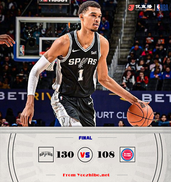 篮球直播吧1月11日讯 NBA常规赛激战正酣,马刺和活塞难兄难弟正面交锋,马刺近期遭遇五连败,目前5胜30负西部垫底,活塞同样遭遇五连败,仅取得3胜34负继续排名联盟倒数第一。此役一上来双方比分一度紧咬,文班得分助攻奉献全能发挥,博扬内外结合短暂回应,中段活塞进攻出现停滞,马刺抓住机会拉开比分,首节结束时马刺确立12分优势,次节回来,双方你来我往火热对攻,但马刺延续火力总能给予回应,两队分差始终维持在两位数左右,半场战罢,马刺依然领先12分。易边再战后瓦塞尔和索汉联手取分,马刺稳扎稳打牢牢占优,三节结束后马刺继续保持18分优势,末节上来,活塞始终无法打出追分高潮,双方分差逐渐来到20分,比赛提前失去悬念,最终马刺130-108大胜对手终结五连败,同时送给活塞六连败。