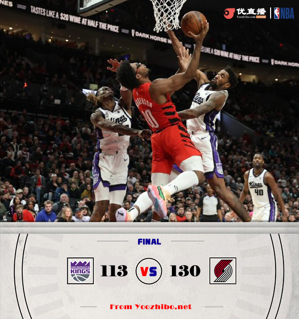 篮球直播吧 12月27日讯 NBA常规赛,开拓者主场迎战国王,开拓者目前7胜21负排在西部第14位,国王则是17胜11负高居西部第4位。比赛上来,小萨博尼斯就在内线连砍7分助队反客为主打出10-2不错开局,布罗格登联手格兰特回应9-0咬住比分,双方展开胶着拉锯战,西蒙斯接连三分,麦基接连暴扣回应,首节国王领先1分,次节开拓者多点开花,里斯和沃克都成为替补奇兵,亨德森也有炸裂暴扣,开拓者打出14-2进攻波一举确立领先,福克斯站出来里突外投连砍10分止血,半场国王落后7分。下半场,小萨博尼斯和巴恩斯接连内线打成并造杀伤,而布罗格登和西蒙斯也能强势回应,开拓者接连造杀伤一波8-0再次拉开比分,末节国王还是靠福克斯和小萨博尼斯苦苦支撑,而开拓者替补继续多点开花牢牢助队保持住双位数领先,最终开拓者130-113力克国王。