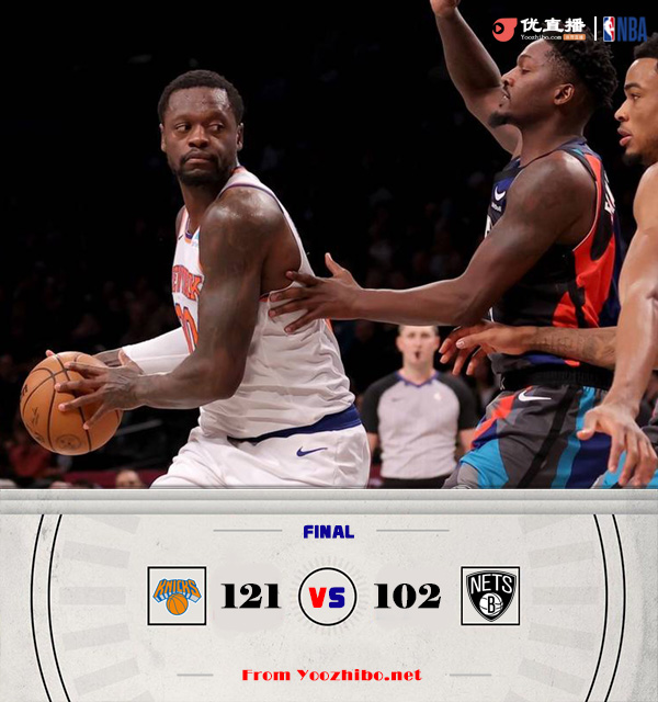 篮球直播吧12月21日讯 NBA常规赛,篮网主场迎战尼克斯。篮网3连败东部第九,尼克斯东部第五。上半场,尼克斯率先发力,多点开花取得领先,布里奇斯手感冰凉单节7投0中,次节篮网进攻回暖稍稍缩小分差,半场战罢尼克斯60-51领先9分。下半场,尼克斯牢牢占据场上主动,始终保持两位数领先,末节尼克斯一波8-0一举将优势扩大到20分以上,篮网大势已去无力回天。最终,尼克斯121-102轻取篮网,客场过关。
