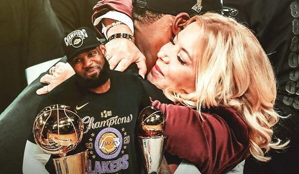 在此前湖人险胜雄鹿期间,詹姆斯坐在珍妮-巴斯以及兰比斯中间并且与她们亲密互动引热议——詹姆斯祝她们国际妇女节快乐,兰比斯搂抱老詹的手臂,珍妮直接依偎在老詹的肩膀上。