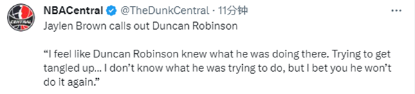 赛后,谈到杰伦-布朗的恶犯动作,邓肯-罗宾逊表示:老实说,我觉得那是一个很脏的动作,这就是球员们会赛季报销的原因,我认为这很危险,没有必要,也太过分了。
