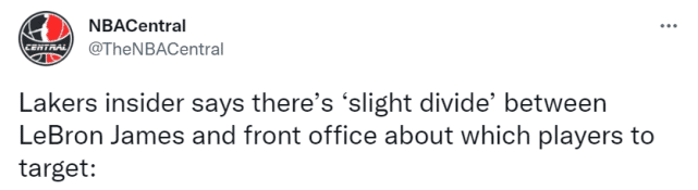 来源:篮球直播吧07-09 09:57篮球直播吧07月09日讯 ,据湖人记者Jovan Buha报道,球队正寻求在交易市场上提升阵容实力,但在球队的引援目标上,超级球星詹姆斯和湖人高管存在一定的分歧。詹姆斯更希望得到前队友欧文,而湖人管理层的一些内部人士更想从步行者换来希尔德和特纳。