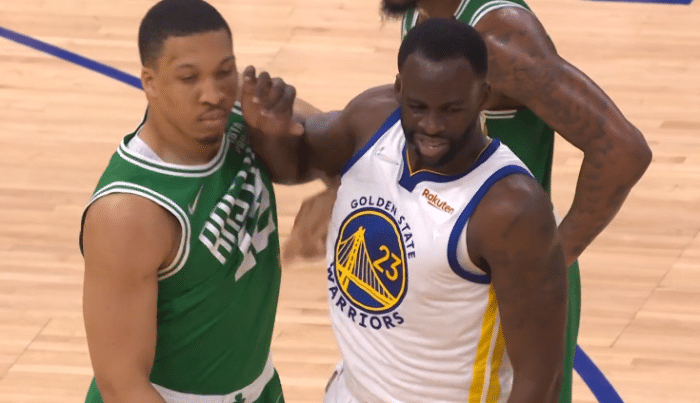 总决赛G2上半场最后时刻,格林对布朗犯规且两人都摔倒,格林倒地后双脚放在布朗的头上,并且有一个从背后推人的动作;布朗被激怒,起身后找格林理论险些打起来,对于这样的激烈争吵,裁判回放之后仅仅吹罚格林防守犯规,没有追加技术犯规。