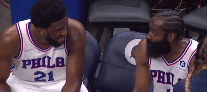 下半场,76人第三节牢牢掌控比赛,甚至领先到20分以上,末节唐斯想带队起势,结果哈登迎着唐斯打成不讲理3+1,紧接着再中三分,比赛还剩4分25秒,76人领先27分,哈登和恩比德都提前打卡下班,两人并肩坐在替补席,开心互动交流。