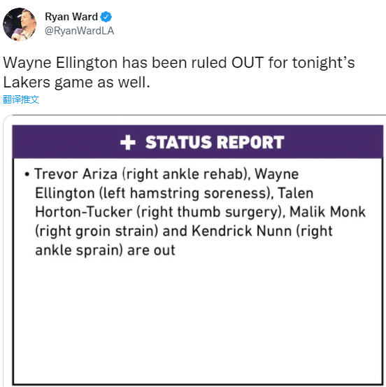 来源:篮球直播吧10-13 11:40篮球直播吧10月13日讯 ,湖人对阵勇士的伤情再次更新,除了阿里扎(右脚踝手术)、霍顿-塔克(右手拇指韧带撕裂)、蒙克(腹股沟拉伤)和纳恩(右脚踝扭伤)伤停之外,神射艾灵顿也伤了,因左腿筋酸痛而缺席比赛;三巨头首秀之夜,全队多达5名伤员真是太难了。