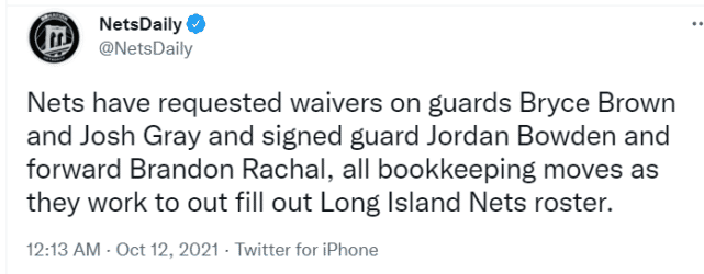 来源:篮球直播吧10-12 14:54篮球直播吧10月12日讯 ,据篮网媒体NetsDaily报道,篮网签下后卫乔丹-鲍登和前锋布兰登-雷查尔,裁掉了一天前签下的布莱斯-布朗和约什-格雷。新签的两名球员预计也会被裁掉,四人都将加入篮网下属的G联赛球队,成为新赛季的备胎。