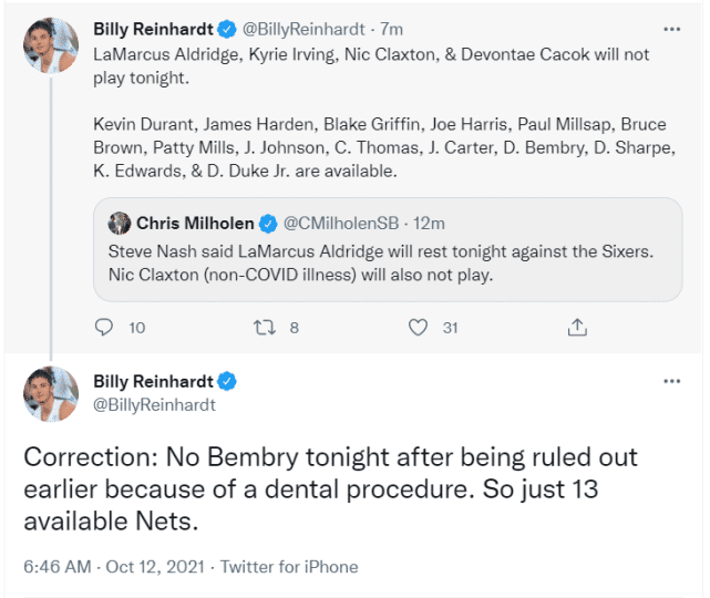 杜兰特和哈登将再次联手出战。对湖人一战,两人没有出场,对雄鹿一战,哈登打了23分钟,9投3中,贡献8分4篮板4助攻,杜兰特打了23分钟,14投5中,贡献18分6篮板3助攻。