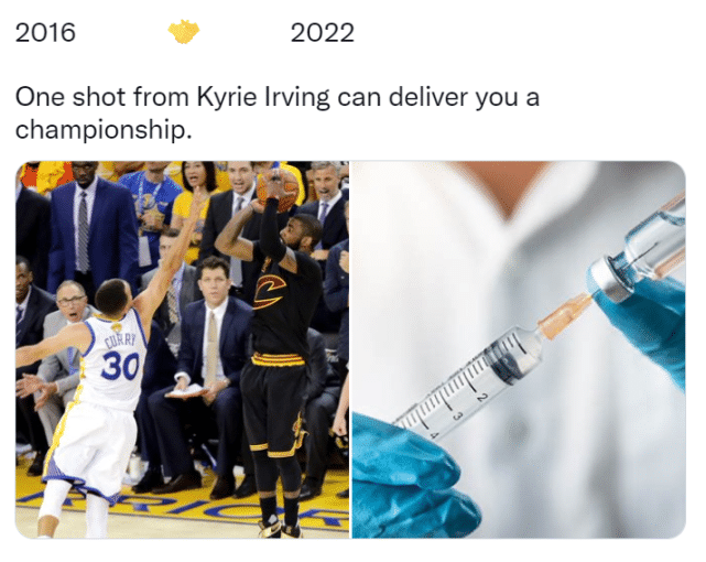 美媒晒出一张合成图调侃欧文:2016年和2022年,欧文的One Shot都能带给你一个总冠军。显然这是一语双关。One Shot既代表了2016年总决赛上的关键一投,也代表了2022年的一针疫苗。