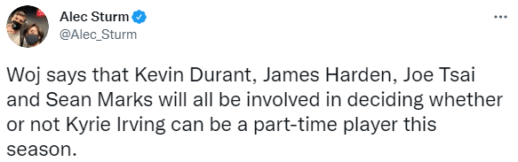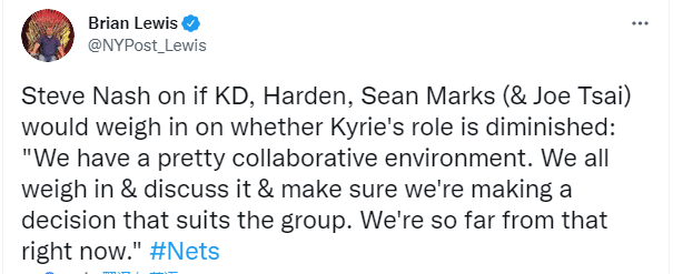 谈到是否会减少欧文角色的话题,纳什表示:我们有一个很团结的氛围,我们全都会(杜兰特、哈登、马克斯、蔡崇信)参与讨论以确保做出最适合团队的决定,但我们距离做出决定还很遥远。