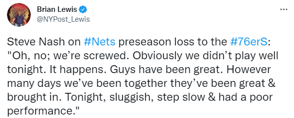 赛后谈到这场失利,纳什表示:我们还有很长的路要走——我们已经很长一段时间很少打篮球了;纳什还走到话筒前,开玩笑说:我们完蛋了;显然我们今晚表现不佳,被狠狠地修理了一顿,我们的球员都太久没怎么打球了,这比赛太不容易了。