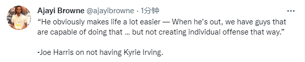 篮网神射乔-哈里斯表示篮网没有打出在训练中的竞争力,今天的失误太多,球队必须减少糟糕的失误;再次谈到欧文的情况,乔哈表示很明显,欧文让生活变得更容易,当他缺席比赛时,我们队内有他的替代者,但我们不会用这种方式制造个人进攻。