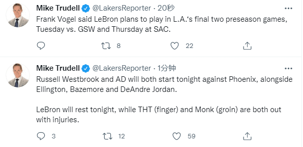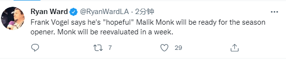 沃格尔透露蒙克的伤情,因腹股沟伤势至少伤停一周,将在一周后再次接受评估,这就相当于蒙克因伤提前季前赛报销,23岁的蒙克是湖人休赛期的重要引援之一,季前赛出战三场,场均上场21分钟能够拿到12.7分2篮板2助攻,投篮命中率51.7%,三分命中率47.1%。