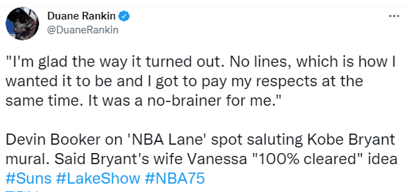 对于这一段致敬科比的拍摄,布克透露在拍摄短片前已经征得了瓦妮莎的同意:我给瓦妮莎打了电话,她100%同意,显然这让我在做这事时会舒服很多,效果也很不错;我喜欢这样,虽然没有台词,但这就是我想表达的,我表达了我的敬意。