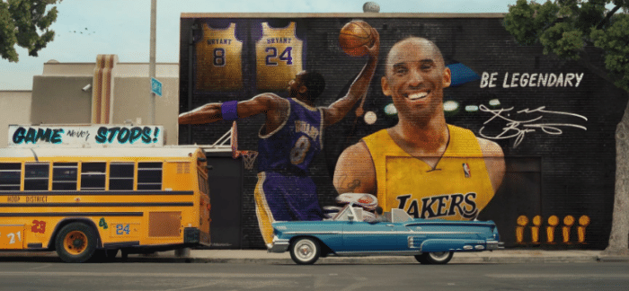 在这部《NBA小巷》短片中,布克一句台词都没有,开着一辆1958年产的经典款老爷车出镜,并停留在了科比的壁画前挥手致敬,音乐突然停下来,布克致敬科比这一幕令人动容。在短片中的巨幅壁画上,画着科比身穿8号球衣暴扣的画面,还有科比已退役的8号和24号球衣以及五座总冠军荣誉。