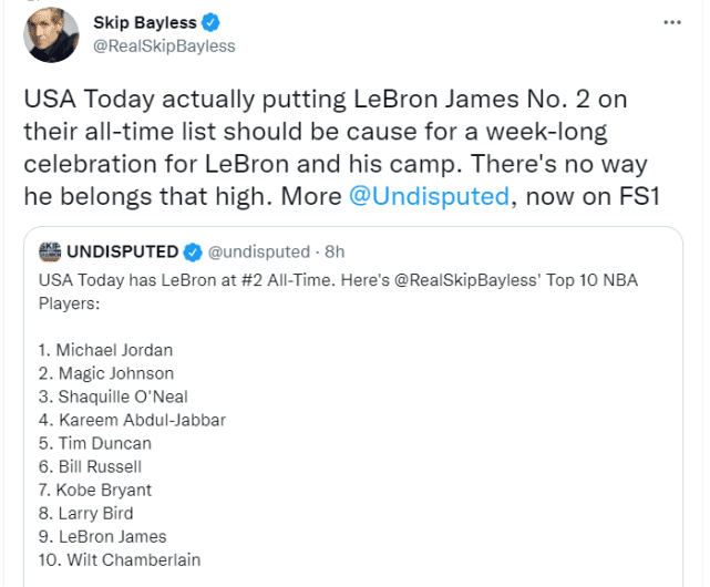 来源:篮球直播吧10-09 16:52篮球直播吧10月09日讯 ,NBA知名评论员斯基普-贝勒斯在节目上谈论《今日美国》的75大巨星排名。《今日美国》将詹姆斯排在历史第二,仅次于乔丹,而贝勒斯公布了自己心中的前十排名,詹姆斯竟然只被他放在第九。