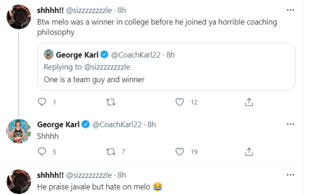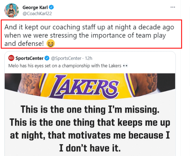 来源:篮球直播吧08-11 10:58篮球直播吧讯 ,安东尼在接受采访时的一番冲冠言论,遭到了前主帅乔治-卡尔的调侃。卡尔和安东尼一向关系不好,他的反应并不让球迷感到意外。