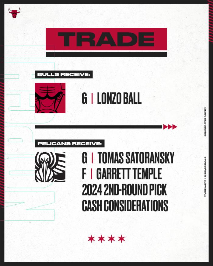来源:篮球直播吧08-09 15:27篮球直播吧讯 北京时间8月9日,公牛和鹈鹕两队关于鲍尔的大交易正式达成,芝加哥公牛官宣,把萨托兰斯基、坦普尔、2024年次轮选秀权以及部分现金送到鹈鹕,从而正式引援郎佐-鲍尔;4换1大交易完成之后,公牛晒出鲍尔身穿公牛2号球衣照,发推:欢迎鲍尔来到芝加哥。