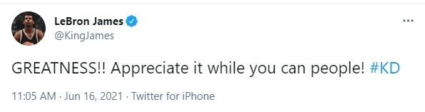 詹姆斯也发推送上了赞美“伟大!!大家请尽你所能地赞美吧!#KD”