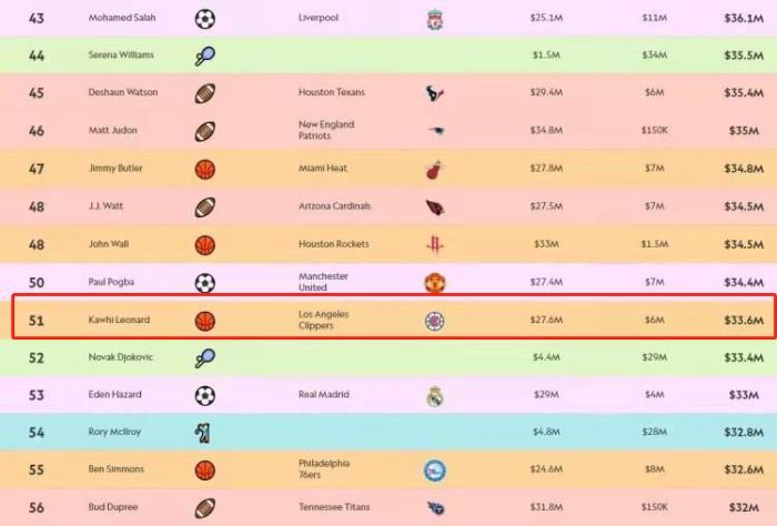 在这份榜单中最让球迷惊讶的莫过于伦纳德,来到大城市的伦纳德似乎并没有展现出自己的商业价值,他的综合收入甚至不如已经连续两年没有打球的汤普森,为什么会造成这样的情况呢?
