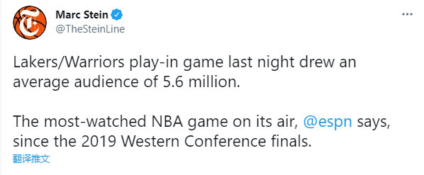 来源:篮球直播吧05-21 10:49篮球直播吧讯 北京时间5月21日,湖人和勇士全美直播收视率出炉,据名记Marc Stein报道,湖人对阵勇士附加赛的平均收视人数为560万人,此数字为19年西决之后最高平均收视,这也是本赛季平均收视最高的一场比赛,詹姆斯和库里两大巨星保证了收视率。