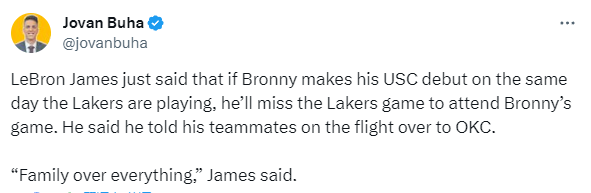 湖人输给雷霆赛后,詹姆斯明确表态,若湖人和南加州大学同一天有比赛,他将请假去看布朗尼的比赛:家庭大于一切;詹姆斯透露他已经在飞机上把这件事告诉他的队友了,他对布朗尼的大学首秀很兴奋。
