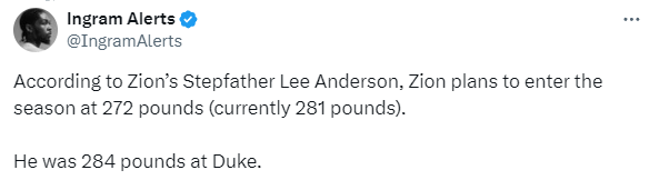 锡安在杜克大学时期的体重为284磅(约129公斤),进入NBA后,锡安的体重一度高达318磅(144公斤),由于体重太大,锡安频频遭遇伤病的困扰,新秀赛季仅仅只打了24场比赛,21-22赛季因伤报销,23-24赛季只打了29场,不过从23-24赛季开始,锡安开始控制饮食并且成功减重。