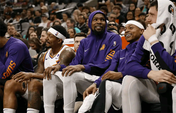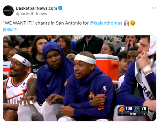 末节太阳领先将近30分,现场球迷高呼:我们想要小托马斯,镜头给到太阳替补席,小托马斯和杜兰特坐在一起,并没有获得上场机会,一直到比赛结束。