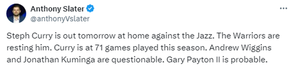 来源:篮球直播吧04-07 16:11篮球直播吧讯 北京时间4月7日,勇士队公布下一场对阵爵士的伤病报告,据勇士随队记者Anthony Slater报道,库里轮休,库明加(膝盖伤势)和维金斯(脚踝伤势)出战成疑,佩顿二世大概率出战。
