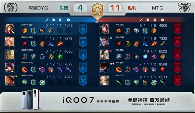 双方常规开局。57秒MTG阿古朵偷掉敌方红BUFF。2分22秒MTG暴君处击杀墨子拿到一血。2分33秒MTG下路击杀百里守约。2分46秒MTG暴君处击杀李元芳。3分06秒深圳DYG野区击杀阿古朵。3分26秒中路下河道双方1换1。4分20秒深圳DYG拿下暴君。5分04秒野区团战MTG打出0换2。7分15秒MTG摧毁敌方中路外塔。8分14秒MTG上路击杀韩信并摧毁上路高地塔。9分08秒MTG拿下暴君。9分38秒深圳DYG野区击杀关羽。10分整MTG下路击杀夏侯惇。10分46秒MTG拿下暗影暴君。11分20秒MTG拿下暗影主宰。11分59秒MTG摧毁敌方中路高地塔。12分15秒高地团战MTG打出1换4。12分34秒MTG摧毁敌方水晶拿下比赛。