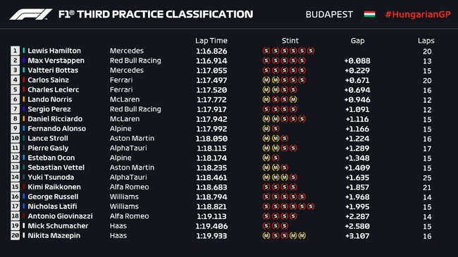 篮球直播吧讯 北京时间07月31日,2021F1匈牙利大奖赛第三次练习赛结束,汉密尔顿圈速最快,维斯塔潘和博塔斯二三位。米克-舒马赫滑出赛道30G上墙,然后去了医疗中心,确认人没事。