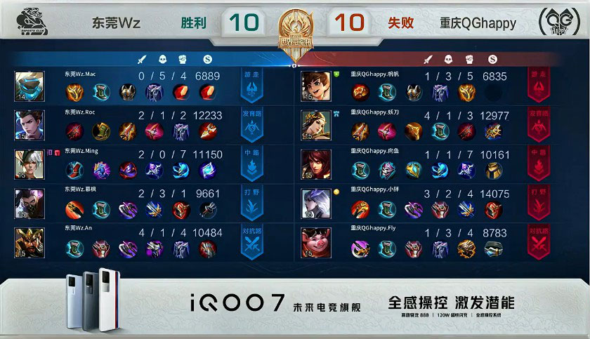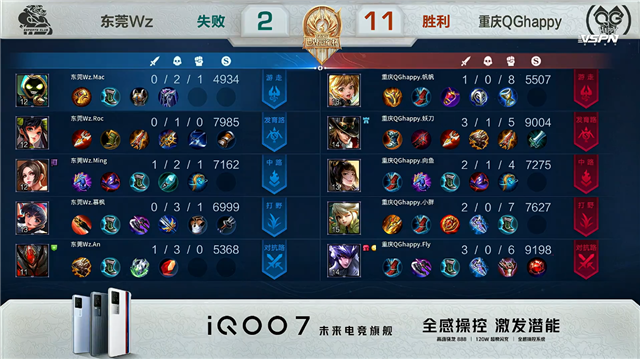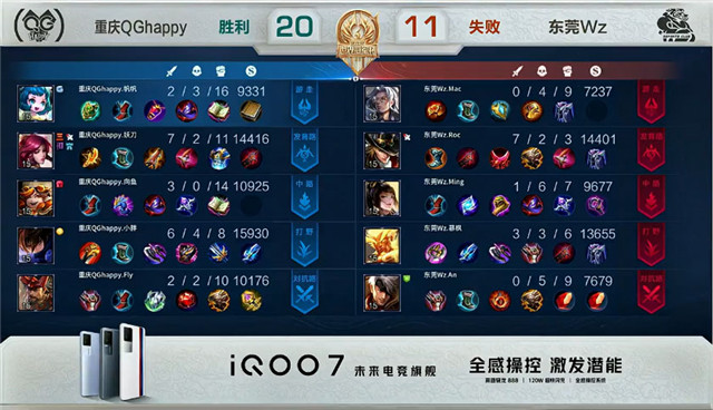 开局东莞Wz入侵野区反掉红BUFF。1分04秒东莞Wz拿下中路河道之灵。2分22秒东莞Wz拿下暴君。3分03秒东莞Wz野区击杀张飞拿到一血。04分40秒重庆QG野区击杀橘右京。5分05秒重庆QG拿下主宰。6分11秒重庆QG上路击杀大乔。6分20秒重庆QG暴君处打出0换2。8分36秒东莞Wz摧毁敌方下路二塔。10分34秒暴君处团战重庆QG打出1换4,娜可露露拿到三连决胜。12分02秒重庆QG暴君处击杀廉颇。13分整上路团战重庆QG打出1换3。13分27秒重庆QG摧毁敌方下路高地塔。15分整重庆QG拿下暗影暴君。15分34秒重庆QG摧毁敌方中路高地塔。16分07秒中路团战东莞Wz击杀吕布。18分26秒重庆QG拿下暗影主宰。20分27秒龙王出团战重庆QG拿下风暴龙王并打出1换3。20分53秒重庆QG摧毁敌方水晶拿下比赛。