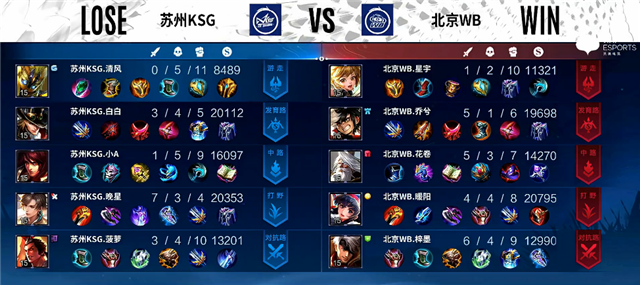1分钟中路团战,夏侯惇拿下一血,北京WB打出1换3。2分20秒娜可露露拿下暴君。2分52秒暃被击杀。4分钟蒙犽推掉下路一塔。4分50秒娜可露露被击杀。5分10秒蒙犽推掉上路二塔。6分28秒蒙犽拿下暴君。7分钟蒙犽推掉下路二塔。7分40秒河道团战,双方1换1。8分12秒暃被击杀。8分30秒蒙犽推掉中路一塔。8分47秒娜可露露拿下主宰。11分钟娜可露露拿下主宰。12分30秒娜可露露拿下暴君。13分20秒高地团战,双方2换2,苏州KSG下路高地塔被破。16分钟娜可露露拿下主宰。17分钟娜可露露拿下暴君。18分10秒北京WB推掉上路高地塔。19分钟娜可露露拿下主宰。19分40秒野区团战,苏州KSG打出1换4。20分44秒暃拿下风暴龙王。21分10秒马可波罗推掉中路一塔。24分24秒马可波罗拿下风暴龙王,团战苏州KSG打出1换2。26分20秒野区团战,双方2换2。27分08秒蒙犽带着兵线推掉水晶拿下本场比赛胜利。