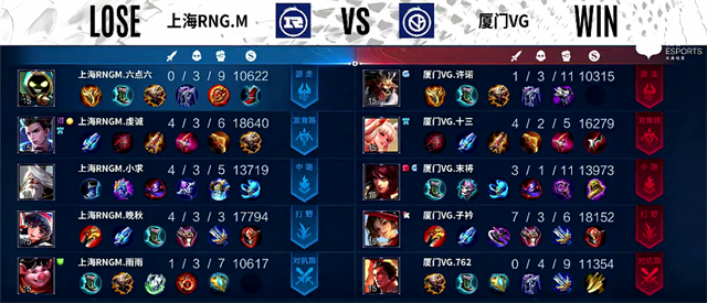 双方和平开局。2分31秒上海RNG.M强攻下路一塔,公孙离拿下一血,双方1换1。3分40秒镜拿下暴君。4分10秒野区团战,厦门VG打出1换2。4分40秒公孙离推掉中路一塔。5分钟澜拿下主宰。6分17秒上海RNG.M下路一塔被破。8分钟野区团战,厦门VG打出0换2。8分20秒中路团战,公孙离拿下双杀。9分17秒镜拿下暴君。10分22秒公孙离拿下暴君。12分钟中路团战,上海RNG.M打出0换2。13分钟镜拿下主宰。14分钟上海RNG.M推掉上路和中路高地塔。14分14秒上海RNG.M推掉水晶率先拿下一分。