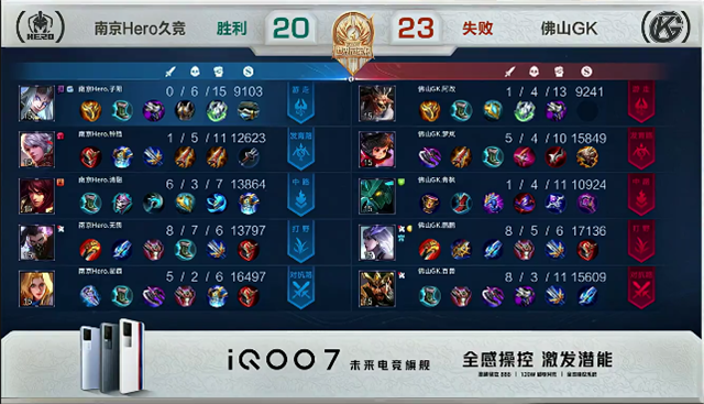 双方和平开局。1分50秒上路团战,马超拿下一血。3分10秒上官婉儿被击杀。3分40秒张良被击杀。4分50秒上路团战,佛山GK打出1换2。5分10秒南京Hero久竞上路一塔被破。6分20秒佛山GK下路一塔被破。6分30秒澜拿下暴君,团战佛山GK打出1换2。6分50秒公孙离推掉中路一塔。7分50秒公孙离拿下主宰。8分45秒野区团战团战,双方1换1。10分24秒阿古朵拿下主宰。10分30秒澜拿下暴君,团战南京Hero久竞打出1换3。11分钟南京Hero久竞推掉中路一塔和二塔。12分钟野区团战,佛山GK打出0换2,佛山GK顺势一波推掉中路高地塔。15分37秒马超拿下暴君。16分35秒野区团战,南京Hero久竞打出0换2。19分10秒上河道团战,南京Hero久竞打出2换5团灭佛山GK。20分01秒南京Hero久竞推掉水晶拿下本场比赛胜利。