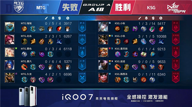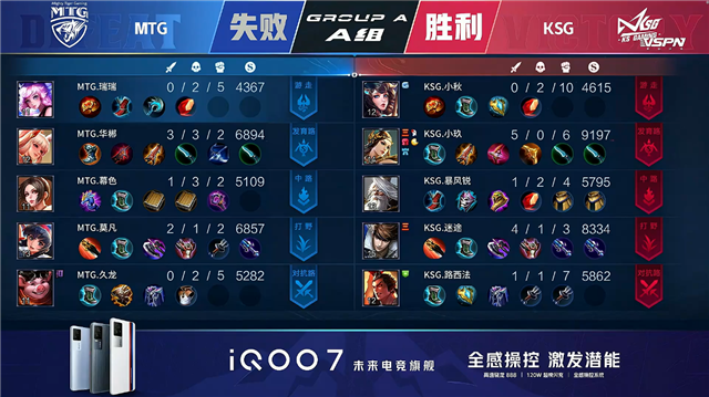 双方常规开局。1分11秒KSG拿到中路河道之灵。2分22秒KSG暴君处击杀橘右京拿到一血。2分32秒KSG拿下暴君。3分30秒KSG野区击杀橘右京。4分15秒KSG摧毁敌方上路外塔。4分41秒KSG摧毁敌方上路二塔。4分54秒KSG下路打出0换2,沈梦溪拿到二连击破。5分13秒野区团战MTG打出1换2。6分09秒中路团战KSG打出2换5。7分34秒下路团战KSG击杀橘右京。8分02秒KSG摧毁敌方下路外塔。8分40秒野区团战KSG打出0换3。8分54秒KSG摧毁敌方中路二塔。9分09秒KSG中路击杀伽罗。9分40秒KSG拿下主宰。10分13秒中路团战双方游走互换,KSG摧毁敌方中路高地塔。10分33秒KSG拿下暗影暴君。11分35秒中路团战KSG打出0换3。11分51秒KSG摧毁敌方水晶拿下比赛。