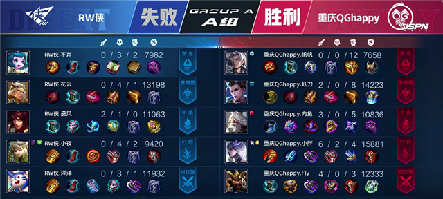 开局双方平稳开局。2分11秒橘右京拿下主宰。2分35秒盘古拿下暴君。3分22秒上河道团战,嫦娥拿下一血。5分41秒公孙离推掉下路一塔。6分26秒虞姬抢下主宰。6分48秒橘右京推掉上路一塔。7分34秒盘古拿下暴君。8分24秒双方互换边路一塔。9分30秒野区团战,大乔被击杀。10分10秒西施被击杀。10分44秒盘古拿下暴君。12分45秒重庆QGhappy强推中路一塔,西施被击杀。12分50秒虞姬推掉上路二塔。13分35秒盘古拿下主宰。14分17秒橘右京被击杀。14分40秒重庆QGhappy强攻上路二塔,西施被击杀。15分钟RW侠中路高地塔被破,团战RW侠打出1换2。15分50秒橘右京拿下暴君。16分钟RW侠推掉中路一塔。16分20秒上河道团战,重庆QGhappy打出0换3,公孙离拿下双杀。重庆QGhappy顺势上路一塔强推高地,团灭RW侠。17分13秒重庆QGhappy点掉水晶率先拿下一分。