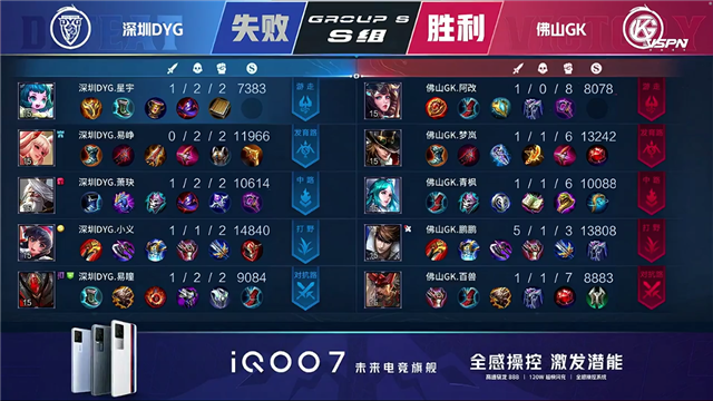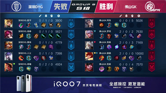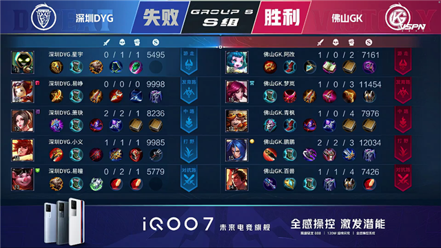 双方平稳开局,2分43秒深圳DYG拿下第一条暴君。5分19秒佛山GK拿下先知主宰,6分钟深圳DYG下路一塔被破。6分51秒深圳DYG拆掉佛山GK中路一塔,佛山GK摧毁深圳DYG上路一塔。8分37秒佛山GK拆掉深圳DYG下路二塔,10分42秒佛山GK拿下暗影暴君。11分47秒团战深圳DYG姜子牙击杀王昭君拿下一血,双方1换1。12分54秒深圳DYG拿下暗影主宰并击杀娜可露露,13分20秒佛山GK拆掉深圳DYG中路一塔。13分40秒佛山GK打出0换3,拆掉深圳DYG上路二塔,14分06秒佛山GK拆掉深圳DYG上路高地。15分20秒深圳DYG拿下暗影暴君,拆掉佛山GK中上路二塔。16分52秒团战佛山GK打出1换4,17分20秒佛山GK带领上路兵线一波摧毁深圳DYG水晶。