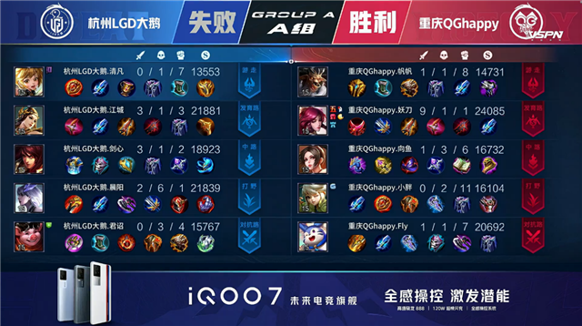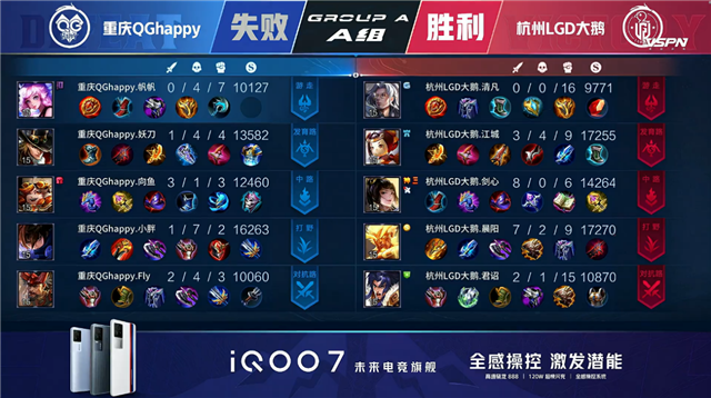 双方常规开局,2分01秒上路杭州LGD大鹅打出0换2。2分51秒重庆QG拿下暴君。3分53秒重庆QG中路击杀橘右京。4分09秒杭州LGD大鹅下路狄仁杰反杀盘古。5分46秒双方互换边路外塔。6分05秒重庆QG拿下主宰。6分32秒野区团战重庆QG打出0换2。6分59秒杭州LGD大鹅中路打出1换2。7分49秒重庆QG野区击杀狄仁杰。11分51秒杭州LGD大鹅拿下暗影暴君。13分14秒杭州LGD大鹅摧毁敌方中路外塔。13分44秒中路团战重庆QG打出1换3。16分26秒杭州LGD大鹅摧毁敌方上路高地塔。19分39秒杭州LGD大鹅野区击杀公孙离。20分30秒重庆QG抢下风暴龙王并打出0换3。20分57秒重庆QG摧毁敌方中路高地塔。21分13秒重庆QG摧毁敌方水晶拿下比赛。