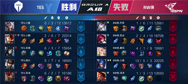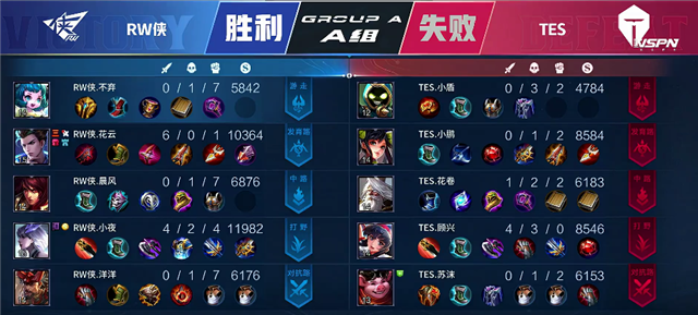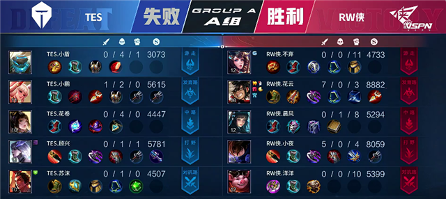 双方和平开局。1分50秒上路团战,兰陵王拿下一血,双方1换1.。2分30秒橘右京拿下主宰。3分30秒橘右京被击杀。4分钟下路团战,双方1换1。4分47秒马可波罗拿下暴君。5分19秒马超推掉上路一塔。5分30秒中路团战,双方1换1。6分10秒马可波罗推掉下路一塔。6分40秒RW侠拿下主宰。7分钟中路团战,双方1换1。7分35秒上河道团战,RW侠打出0换3。7分55秒RW侠推掉中路一塔。8分40秒马超推掉上路二塔。10分15秒下河道团战,TES打出0换3。10分30秒蒙犽推掉下路一塔。10分55秒TES拿下暴君。12分钟中路团战,双方打出2换2,兰陵王拿下双杀。12分55秒TES下路二塔被破。13分50秒橘右京拿下主宰,团战TES打出2换3,蒙犽拿下双杀。15分15秒暴君团,TES打出2换3,马超拿下双杀。16分30秒橘右京拿下暴君。18分15秒橘右京拿下主宰。20分30秒龙王团,RW侠打出3换5,兰陵王拿下风暴龙王。RW侠顺势下路一波直上高地,21分38秒RW侠攻破水晶拿下本场比赛胜利。