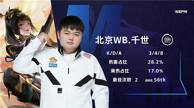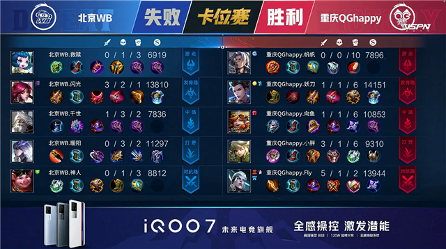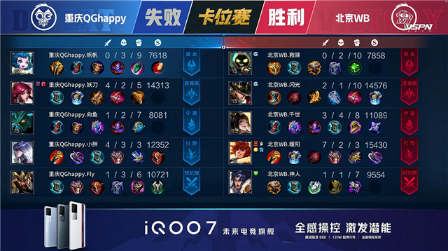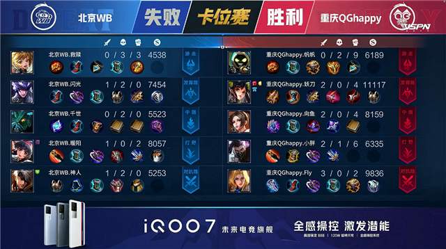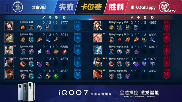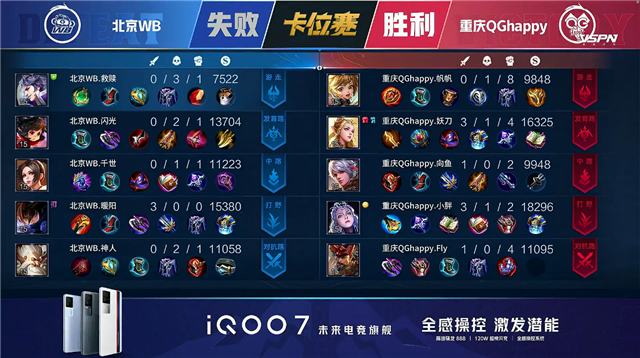 双方平稳开局。1分10秒北京WB拿下中路河道之灵。3分16秒北京WB拿下暴君。5分14秒北京WB摧毁敌方下路外塔。6分58秒重庆QG野区击杀上官婉儿拿到一血。7分34秒中路下河道团战重庆QG打出2换5并摧毁敌方中路外塔。9分02秒重庆QG拿下主宰。9分59秒中路团战北京WB打出0换3。10分44秒北京WB拿下暗影暴君。11分25秒北京WB摧毁敌方上路二塔。11分33秒北京WB摧毁敌方中路外塔。12分29秒北京WB拿下暗影主宰。13分27秒主宰处团战重庆QG打出2换3。13分49秒重庆QG摧毁敌方中路二塔。15分57秒野区团战双方1换1。16分41秒北京WB拿下暗影暴君。17分26秒北京WB拿下暗影主宰。18分29秒下路团战北京WB团灭对手摧毁水晶拿下比赛,裴擒虎拿到三连决胜。