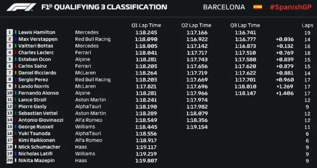 篮球直播吧讯 北京时间5月8日晚,2021F1西班牙大奖赛排位赛在加泰罗尼亚赛道结束。经过1个多小时的争斗,梅奔车手汉密尔顿以1分16秒741的成绩夺得职业生涯第100个杆位,维斯塔潘落后0.036秒排名第二,博塔斯落后0.132秒排名第三。P4-P10分别为:勒克莱尔、奥康、塞恩斯、里卡多、佩雷兹、诺里斯和阿隆索。