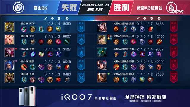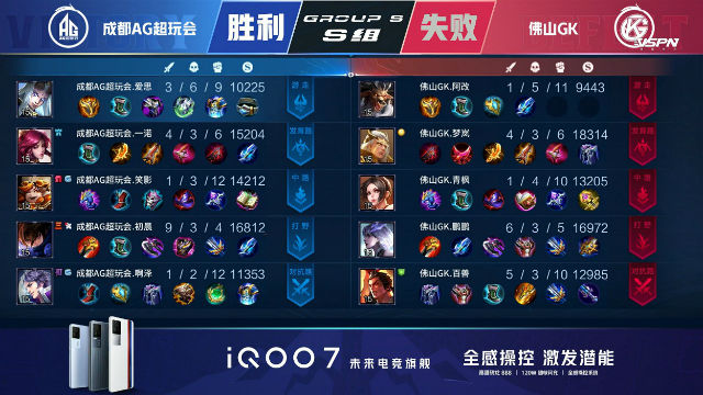 双方平稳开局。2分16秒佛山GK拿下主宰,成都AG拿下暴君。2分37秒佛山GK下路打出1换2。4分13秒佛山GK摧毁敌方上路外塔。5分01秒佛山GK上路击杀橘右京,成都AG摧毁敌方中路外塔。6分09秒成都AG摧毁敌方下路外塔。6分36秒成都AG拿下主宰。6分51秒佛山GK拿下暴君。7分05秒下路团战成都AG打出1换2。9分27秒成都AG摧毁敌方下路二塔。9分40秒佛山GK摧毁敌方上路二塔。12分14秒成都AG野区打出0换2。12分37秒成都AG拿下暗影暴君。12分43秒成都AG拿下中路二塔。12分52秒团战成都AG击杀大乔并摧毁中路高地塔。13分32秒下路团战成都AG打出2换4。13分56秒成都AG团灭对手摧毁水晶拿下比赛。