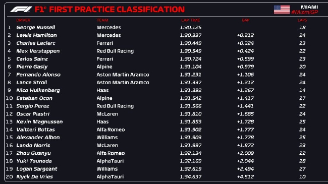 篮球直播吧讯 北京时间05月06日,2023年F1迈阿密大奖赛第1次练习赛结束,梅赛德斯车队拉塞尔以1:30.125排名第一,他的队友汉密尔顿落后0.212秒排名第二,法拉利车队勒克莱尔落后0.324秒排名第三。维斯塔潘和塞恩斯分列四五位,排名六至十位的车手分别是加斯利、阿隆索、斯托尔、霍肯伯格、奥康。