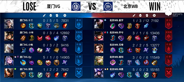 2分10秒下路团战,虞姬拿下一血。3分钟下路团战,虞姬被击杀。4分30秒刘邦被击杀。5分钟镜拿下暴君。5分18秒虞姬推掉下路一塔。5分30秒西施被击杀。6分钟虞姬被击杀。6分钟上路团战,双方1换1。7分钟镜推掉中路一塔,关羽被击杀。8分钟镜拿下主宰。9分钟下路团战,北京WB打出1换4。9分40秒镜拿下暴君。11分钟中路团战,双方2换2,澜拿下主宰。13分钟镜拿下暴君。14分钟镜拿下主宰,澜拿下暴君。15分20秒中路团战,北京WB1换4团灭厦门VG。15分52秒北京WB推掉水晶拿下本场比赛胜利。