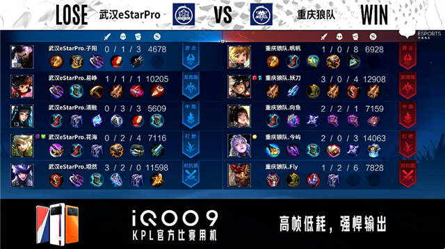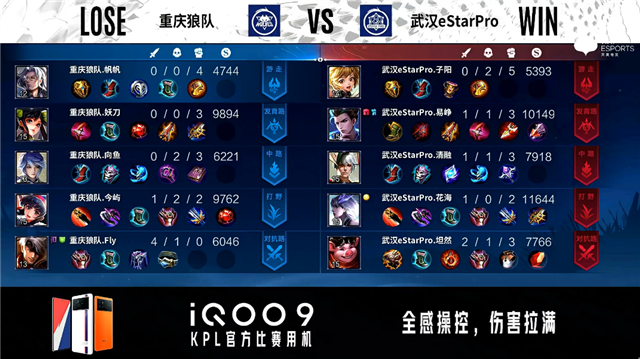 开局武汉eStar中路、发育路换线。3分48秒武汉eStar拿下主宰。5分18秒武汉eStar摧毁敌方对抗路外塔。5分34秒重庆狼队发育路击杀云缨拿到一血。7分32秒重庆狼队对抗路击杀马可波罗。8分17秒重庆狼队拿下主宰。9分34秒武汉eStar中路击杀墨子。10分55秒主宰处团战重庆狼队打出2换4。11分18秒重庆狼队摧毁敌方对抗路二塔。12分16秒重庆狼队镜发育路单杀云缨。12分27秒重庆狼队中路击杀周瑜。12分48秒重庆狼队摧毁敌方中路高地塔。14分43秒武汉eStar发育路击杀百里守约。15分27秒武汉eStar拿下暗影主宰。15分34秒武汉eStar野区击杀镜。16分39秒重庆狼队镜对抗路单杀云缨。18分18秒中路团战重庆狼队击杀张飞。18分50秒高地团战重庆狼队打出0换3摧毁水晶拿下比赛。
