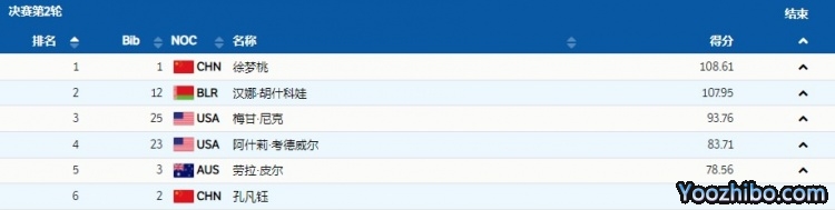篮球直播吧 2月14日讯 冬奥会自由式滑雪女子空中技巧决赛的第2轮正在进行,中国选手徐梦桃、孔凡钰在决赛第1轮中以第二、三晋级。第二轮决赛仅有一跳的机会。