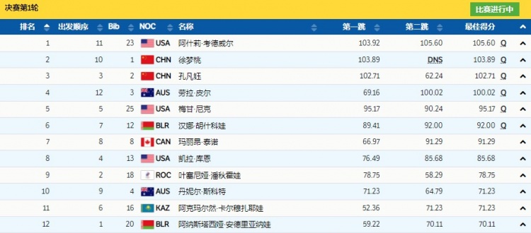 篮球直播吧讯2月14日讯 冬奥会自由式滑雪女子空中技巧决赛的第1轮正在进行,中国选手徐梦桃、孔凡钰出战。决赛第一轮,参赛选手将完成两次跳跃,取其中的最好成绩进行排名。前6名晋级决赛第二轮。